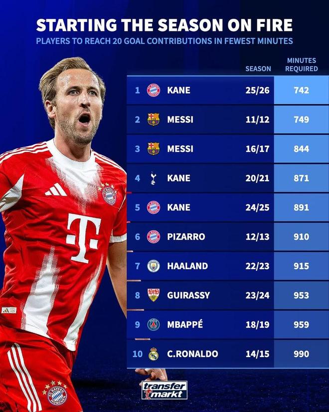 凯恩本赛季为拜仁效力了742分钟,并直接参加了20个进球,其中包括17个进球和3个助攻。根据德国转会网站的统计数据,凯恩(Kane)是参加本赛季前20点的时间最少的球员。 The lowest time to participate in the first 20 purposes of the season is 1. Kane 2025-26 Season 742 minutes 2. Messi 2011-12 Season 749 Minutes 3. Messi 2016-17 Season 844 Minutes 4. Kane 2020-21 Season 871 Minutes 5. Kane 2024-25 Season 891 Minutes 6. Pizarro 2012-13 Season 910 Minute 915 minutes 8. Gilasi 2023-24 Season 953 Minutes 9. Mbappe 2018-19季959分钟10。Ronaldo2014-15季990分钟[在Migu独家英超联赛中]